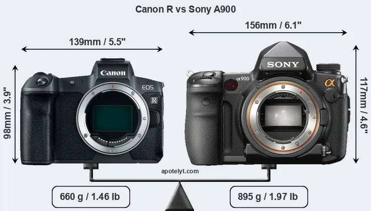 The side-by-side display below illustrates the physical size and weight of the Canon R and the Sony A900. The two cameras are presented according to their relative size. Three consecutive views from the front, the top, and the rear side are shown. All width, height and depth dimensions are rounded to the nearest millimeter.