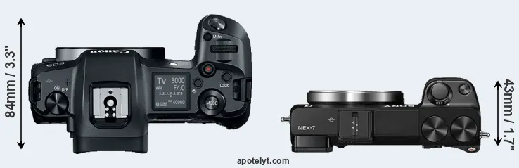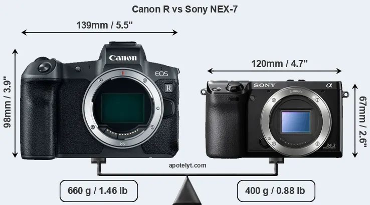 An illustration of the physical size and weight of the Canon R and the Sony NEX-7 is provided in the side-by-side display below. The two cameras are presented according to their relative size. Three consecutive perspectives from the front, the top, and the back are available. All size dimensions are rounded to the nearest millimeter.