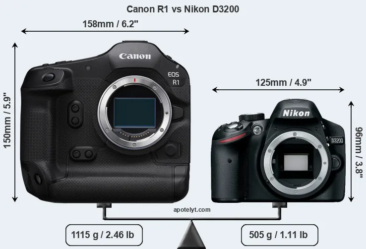 The side-by-side display below illustrates the physical size and weight of the Canon R1 and the Nikon D3200. The two cameras are presented according to their relative size. Three consecutive views from the front, the top, and the rear side are shown. All width, height and depth measures are rounded to the nearest millimeter.