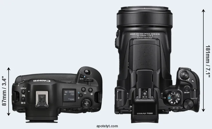 The side-by-side display below illustrates the physical size and weight of the Canon R1 and the Nikon P1000. The two cameras are presented according to their relative size. Three consecutive perspectives from the front, the top, and the back are available. All width, height and depth measures are rounded to the nearest millimeter.