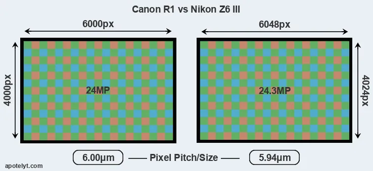 Despite having a slightly smaller sensor, the Z6 III offers a slightly higher resolution of 24.3 megapixels, compared with 24 MP of the R1. This megapixels advantage comes at the cost of a higher pixel density and a smaller size of the individual pixel (with a pixel pitch of 5.94μm versus 6.00μm for the R1). It is noteworthy in this context that the two cameras were released in close succession, so that their sensors are from the same technological generation.