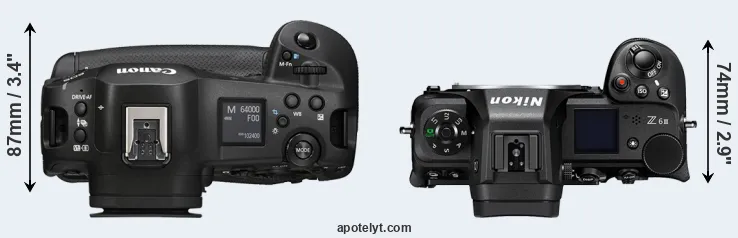 An illustration of the physical size and weight of the Canon R1 and the Nikon Z6 III is provided in the side-by-side display below. The two cameras are presented according to their relative size. Three consecutive perspectives from the front, the top, and the back are available. All width, height and depth measures are rounded to the nearest millimeter.