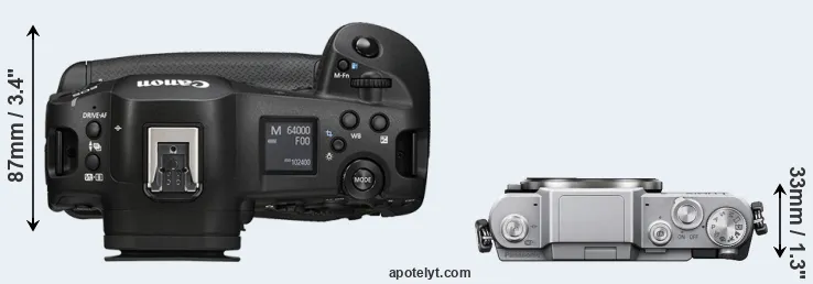 An illustration of the physical size and weight of the Canon R1 and the Panasonic GF7 is provided in the side-by-side display below. The two cameras are presented according to their relative size. Three consecutive views from the front, the top, and the rear side are shown. All width, height and depth measures are rounded to the nearest millimeter.