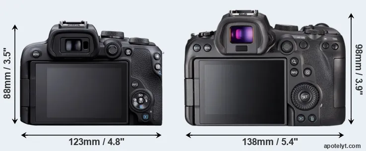 The side-by-side display below illustrates the physical size and weight of the Canon R10 and the Canon R6. The two cameras are presented according to their relative size. Three successive views from the front, the top, and the rear are shown. All width, height and depth measures are rounded to the nearest millimeter.
