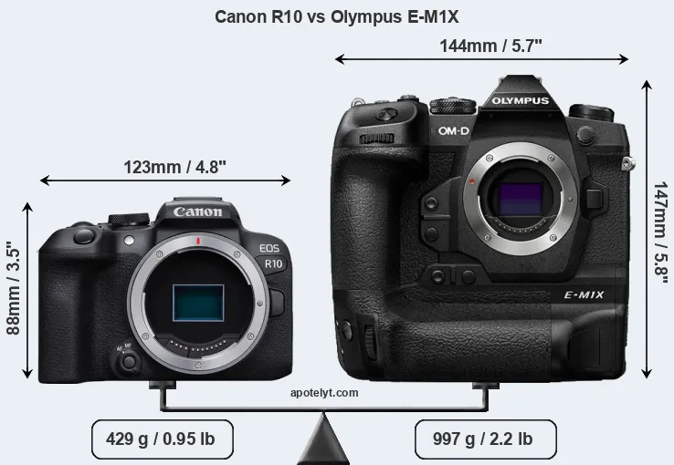 If the front view area (width x height) of the cameras is taken as an aggregate measure of their size, the Olympus E-M1X is considerably larger (96 percent) than the Canon R10. Moreover, the E-M1X is substantially heavier (132 percent) than the R10. It is noteworthy in this context that the E-M1X is splash and dust-proof, while the R10 does not feature any corresponding weather-sealing.
