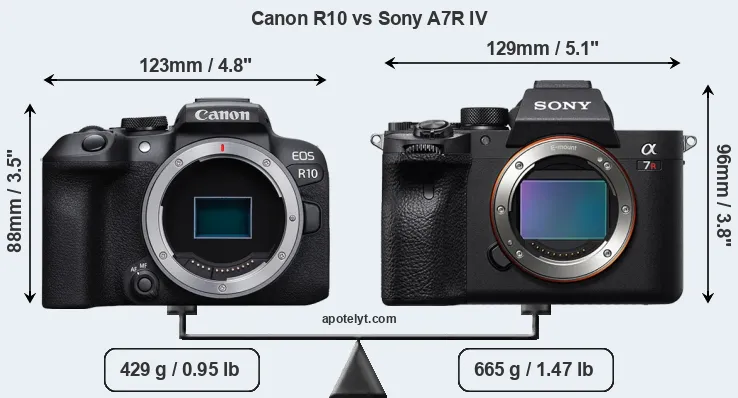 If the front view area (width x height) of the cameras is taken as an aggregate measure of their size, the Sony A7R IV is notably larger (14 percent) than the Canon R10. Moreover, the A7R IV is substantially heavier (55 percent) than the R10. It is noteworthy in this context that the A7R IV is splash and dust-proof, while the R10 does not feature any corresponding weather-sealing.