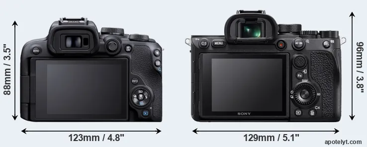 The physical size and weight of the Canon R10 and the Sony A7R IV are illustrated in the side-by-side display below. The two cameras are presented according to their relative size. Three consecutive views from the front, the top, and the rear side are shown. All width, height and depth measures are rounded to the nearest millimeter.