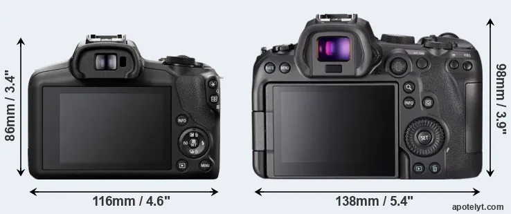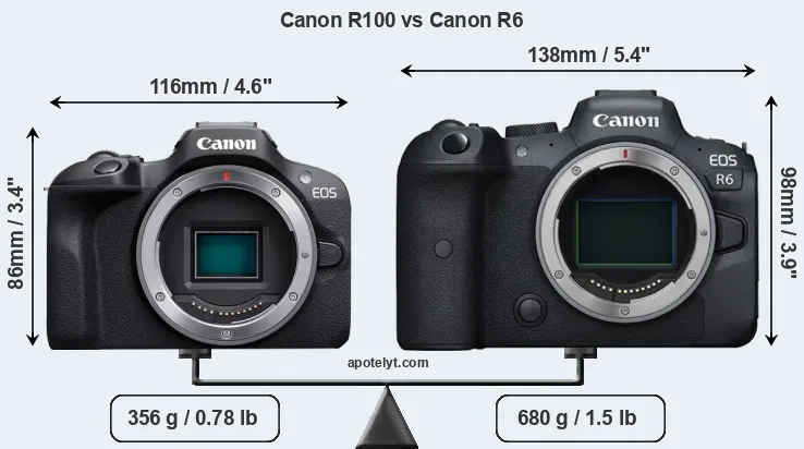 If the front view area (width x height) of the cameras is taken as an aggregate measure of their size, the Canon R6 is notably larger (36 percent) than the Canon R100. Moreover, the R6 is substantially heavier (91 percent) than the R100. It is noteworthy in this context that the R6 is splash and dust-proof, while the R100 does not feature any corresponding weather-sealing.