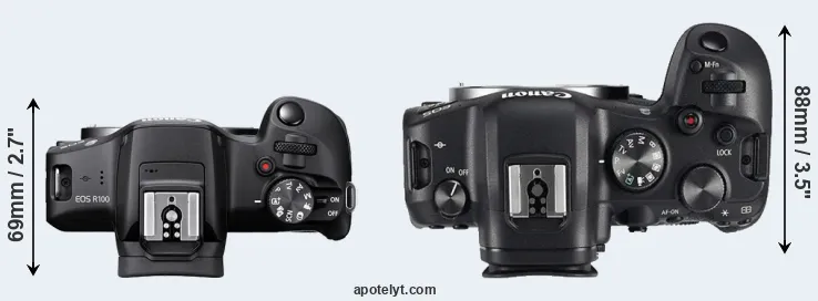 An illustration of the physical size and weight of the Canon R100 and the Canon R6 is provided in the side-by-side display below. The two cameras are presented according to their relative size. Three consecutive perspectives from the front, the top, and the back are available. All width, height and depth dimensions are rounded to the nearest millimeter.