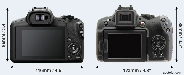 The side-by-side display below illustrates the physical size and weight of the Canon R100 and the Canon SX10. The two cameras are presented according to their relative size. Three consecutive perspectives from the front, the top, and the back are available. All width, height and depth dimensions are rounded to the nearest millimeter.
