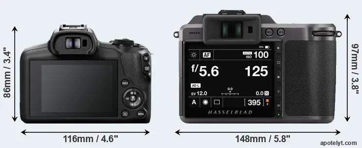 Going beyond this snapshot of core features and characteristics, what are the differences between the Canon EOS R100 and the Hasselblad X1D II 50C? Which one should you buy? Read on to find out how these two cameras compare with respect to their body size, their imaging sensors, their shooting features, their input-output connections, and their reception by expert reviewers.