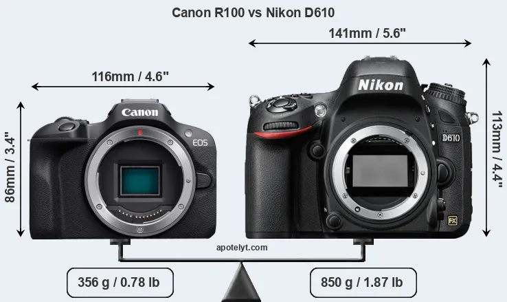 The physical size and weight of the Canon R100 and the Nikon D610 are illustrated in the side-by-side display below. The two cameras are presented according to their relative size. Three consecutive perspectives from the front, the top, and the back are available. All width, height and depth dimensions are rounded to the nearest millimeter.