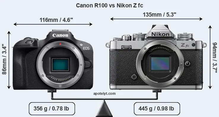 An illustration of the physical size and weight of the Canon R100 and the Nikon Z fc is provided in the side-by-side display below. The two cameras are presented according to their relative size. Three successive views from the front, the top, and the rear are shown. All width, height and depth dimensions are rounded to the nearest millimeter.