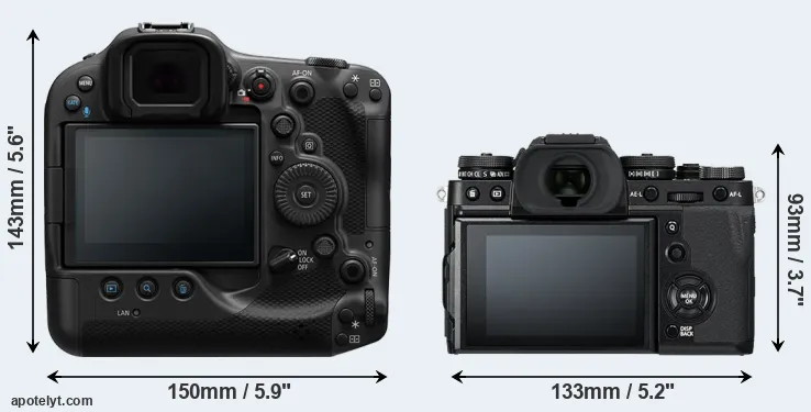 The side-by-side display below illustrates the physical size and weight of the Canon R3 and the Fujifilm X-T3. The two cameras are presented according to their relative size. Three consecutive perspectives from the front, the top, and the back are available. All size dimensions are rounded to the nearest millimeter.
