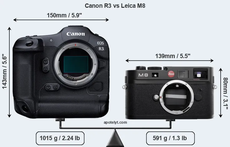 The physical size and weight of the Canon R3 and the Leica M8 are illustrated in the side-by-side display below. The two cameras are presented according to their relative size. Three consecutive perspectives from the front, the top, and the back are available. All width, height and depth dimensions are rounded to the nearest millimeter.