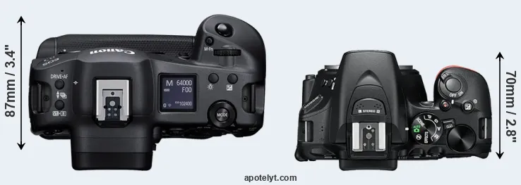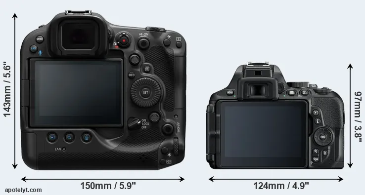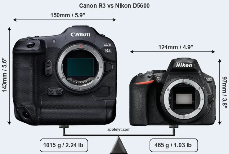 The physical size and weight of the Canon R3 and the Nikon D5600 are illustrated in the side-by-side display below. The two cameras are presented according to their relative size. Three consecutive views from the front, the top, and the rear side are shown. All size dimensions are rounded to the nearest millimeter.