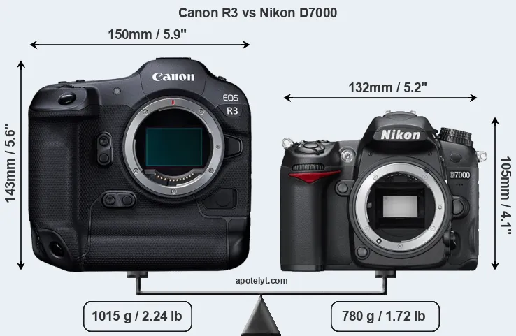 The side-by-side display below illustrates the physical size and weight of the Canon R3 and the Nikon D7000. The two cameras are presented according to their relative size. Three successive views from the front, the top, and the rear are shown. All width, height and depth dimensions are rounded to the nearest millimeter.