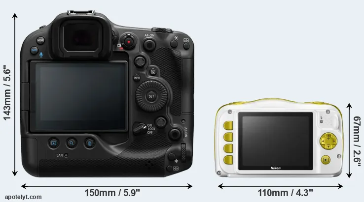 An illustration of the physical size and weight of the Canon R3 and the Nikon W150 is provided in the side-by-side display below. The two cameras are presented according to their relative size. Three successive views from the front, the top, and the rear are shown. All width, height and depth dimensions are rounded to the nearest millimeter.