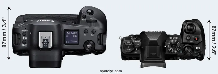 An illustration of the physical size and weight of the Canon R3 and the Olympus E-M1 II is provided in the side-by-side display below. The two cameras are presented according to their relative size. Three successive views from the front, the top, and the rear are shown. All width, height and depth dimensions are rounded to the nearest millimeter.