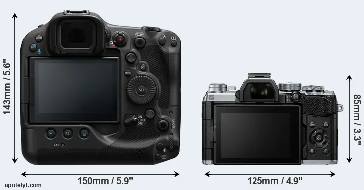 The side-by-side display below illustrates the physical size and weight of the Canon R3 and the Olympus E-M5 III. The two cameras are presented according to their relative size. Three consecutive views from the front, the top, and the rear side are shown. All width, height and depth dimensions are rounded to the nearest millimeter.