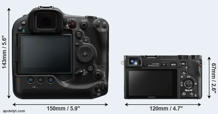An illustration of the physical size and weight of the Canon R3 and the Sony A6000 is provided in the side-by-side display below. The two cameras are presented according to their relative size. Three successive views from the front, the top, and the rear are shown. All width, height and depth dimensions are rounded to the nearest millimeter.