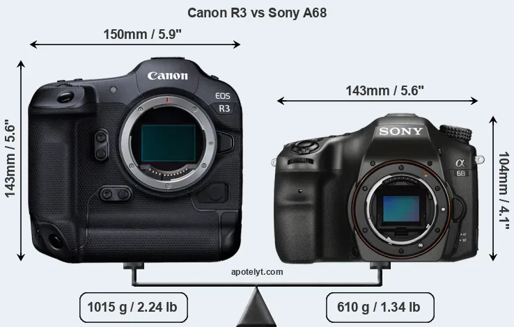 The side-by-side display below illustrates the physical size and weight of the Canon R3 and the Sony A68. The two cameras are presented according to their relative size. Three consecutive views from the front, the top, and the rear side are shown. All width, height and depth dimensions are rounded to the nearest millimeter.