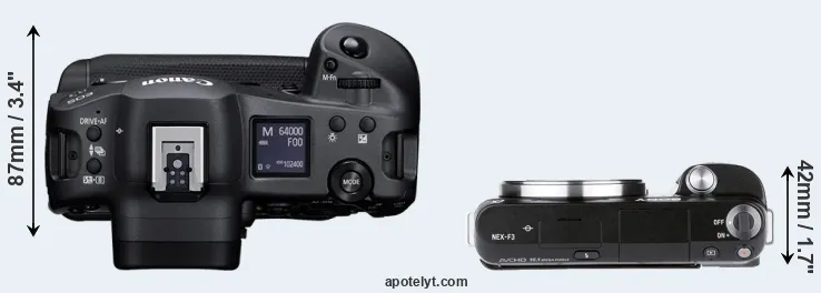 The physical size and weight of the Canon R3 and the Sony NEX-F3 are illustrated in the side-by-side display below. The two cameras are presented according to their relative size. Three consecutive views from the front, the top, and the rear side are shown. All size dimensions are rounded to the nearest millimeter.