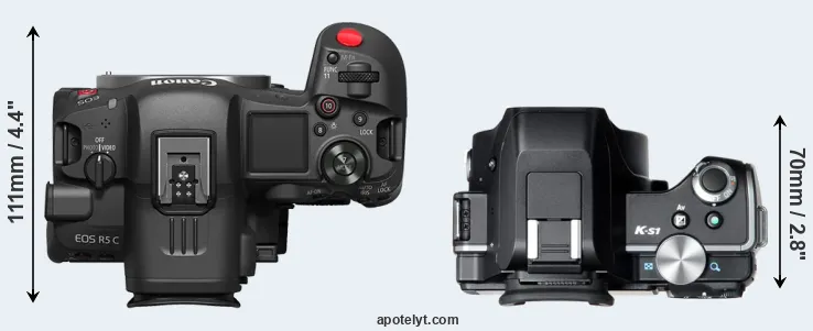 The physical size and weight of the Canon R5 C and the Pentax K-S1 are illustrated in the side-by-side display below. The two cameras are presented according to their relative size. Three consecutive views from the front, the top, and the rear side are shown. All width, height and depth dimensions are rounded to the nearest millimeter.