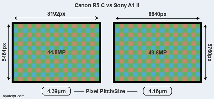 Despite having a slightly smaller sensor, the A1 II offers a higher resolution of 49.8 megapixels, compared with 44.8 MP of the R5 C. This megapixels advantage comes at the cost of a higher pixel density and a smaller size of the individual pixel (with a pixel pitch of 4.16μm versus 4.39μm for the R5 C). However, it should be noted that the A1 II is much more recent (by 2 years and 10 months) than the R5 C, and its sensor will have benefitted from technological advances during this time that make it possible to gather light more efficiently. Coming back to sensor resolution, it should be mentioned that the A1 II has no anti-alias filter installed, so that it can capture all the detail its sensor resolves.