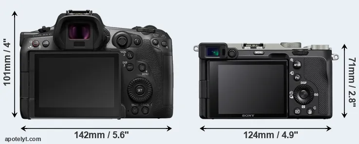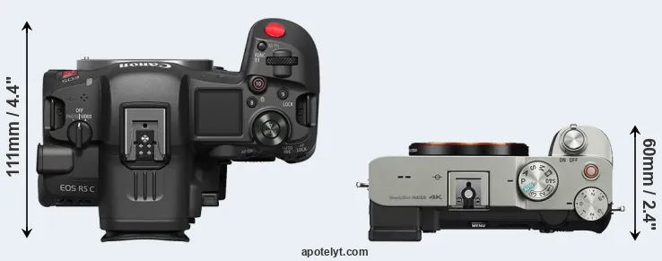 The side-by-side display below illustrates the physical size and weight of the Canon R5 C and the Sony A7C. The two cameras are presented according to their relative size. Three consecutive perspectives from the front, the top, and the back are available. All width, height and depth measures are rounded to the nearest millimeter.