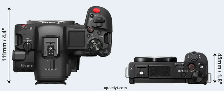 The physical size and weight of the Canon R5 C and the Sony ZV-E10 are illustrated in the side-by-side display below. The two cameras are presented according to their relative size. Three successive views from the front, the top, and the rear are shown. All width, height and depth measures are rounded to the nearest millimeter.