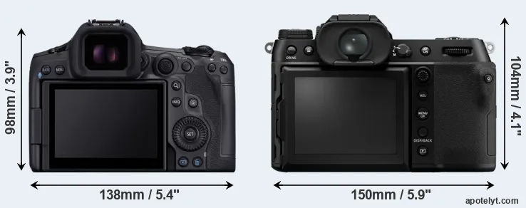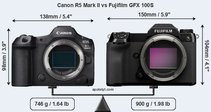 The side-by-side display below illustrates the physical size and weight of the Canon R5 Mark II and the Fujifilm GFX 100S. The two cameras are presented according to their relative size. Three consecutive views from the front, the top, and the rear side are shown. All width, height and depth measures are rounded to the nearest millimeter.