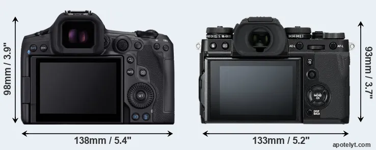 The side-by-side display below illustrates the physical size and weight of the Canon R5 Mark II and the Fujifilm X-T3. The two cameras are presented according to their relative size. Three successive views from the front, the top, and the rear are shown. All width, height and depth measures are rounded to the nearest millimeter.