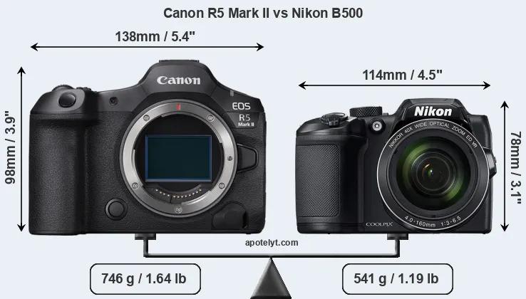 The side-by-side display below illustrates the physical size and weight of the Canon R5 Mark II and the Nikon B500. The two cameras are presented according to their relative size. Three consecutive perspectives from the front, the top, and the back are available. All width, height and depth dimensions are rounded to the nearest millimeter.