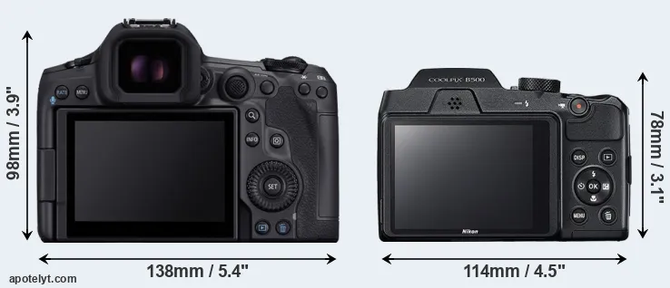 Going beyond this snapshot of core features and characteristics, what are the differences between the Canon EOS R5 Mark II and the Nikon Coolpix B500? Which one should you buy? Read on to find out how these two cameras compare with respect to their body size, their imaging sensors, their shooting features, their input-output connections, and their reception by expert reviewers.