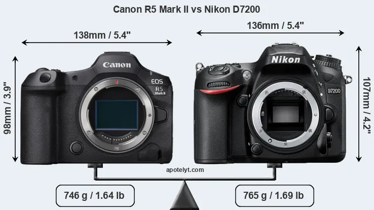 The physical size and weight of the Canon R5 Mark II and the Nikon D7200 are illustrated in the side-by-side display below. The two cameras are presented according to their relative size. Three successive views from the front, the top, and the rear are shown. All width, height and depth dimensions are rounded to the nearest millimeter.