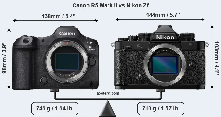The side-by-side display below illustrates the physical size and weight of the Canon R5 Mark II and the Nikon Zf. The two cameras are presented according to their relative size. Three successive views from the front, the top, and the rear are shown. All size dimensions are rounded to the nearest millimeter.