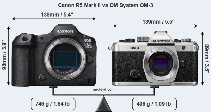 An illustration of the physical size and weight of the Canon R5 Mark II and the OM System OM-3 is provided in the side-by-side display below. The two cameras are presented according to their relative size. Three successive views from the front, the top, and the rear are shown. All width, height and depth measures are rounded to the nearest millimeter.