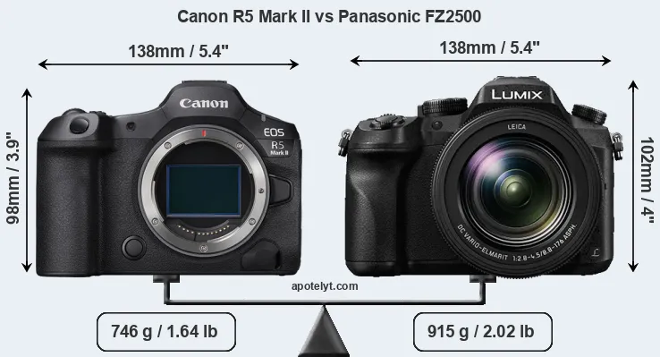 The physical size and weight of the Canon R5 Mark II and the Panasonic FZ2500 are illustrated in the side-by-side display below. The two cameras are presented according to their relative size. Three successive views from the front, the top, and the rear are shown. All width, height and depth measures are rounded to the nearest millimeter.