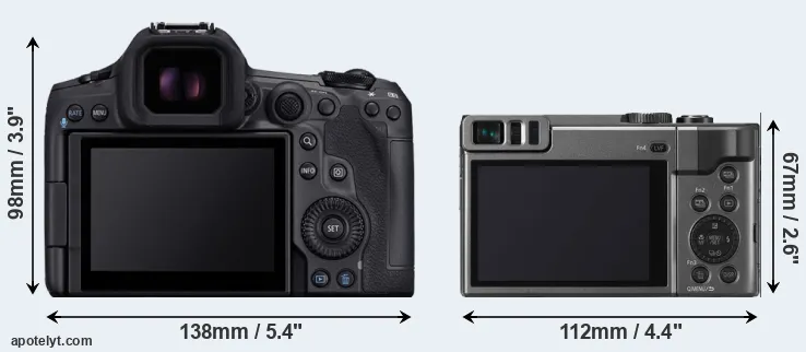 The above size and weight comparisons are to some extent incomplete and possibly misleading, as the TZ90 has a lens built in, whereas the R5 Mark II is an interchangeable lens camera that requires a separate lens. Attaching the latter will add extra weight and bulk to the setup.