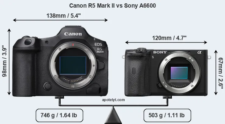 The side-by-side display below illustrates the physical size and weight of the Canon R5 Mark II and the Sony A6600. The two cameras are presented according to their relative size. Three consecutive perspectives from the front, the top, and the back are available. All width, height and depth dimensions are rounded to the nearest millimeter.