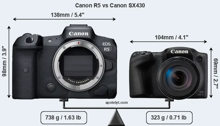 An illustration of the physical size and weight of the Canon R5 and the Canon SX430 is provided in the side-by-side display below. The two cameras are presented according to their relative size. Three consecutive perspectives from the front, the top, and the back are available. All width, height and depth dimensions are rounded to the nearest millimeter.