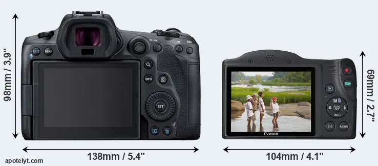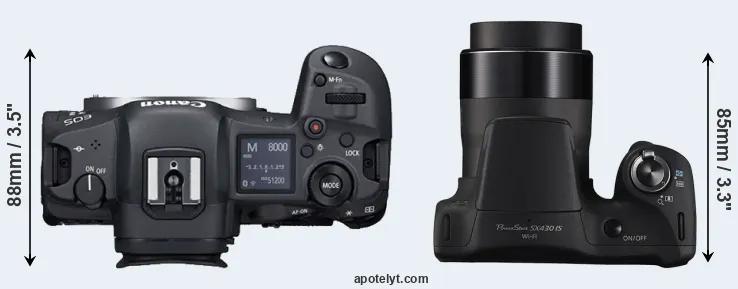 The above size and weight comparisons are to some extent incomplete and possibly misleading, as the SX430 has a lens built in, whereas the R5 is an interchangeable lens camera that requires a separate lens. Attaching the latter will add extra weight and bulk to the setup.