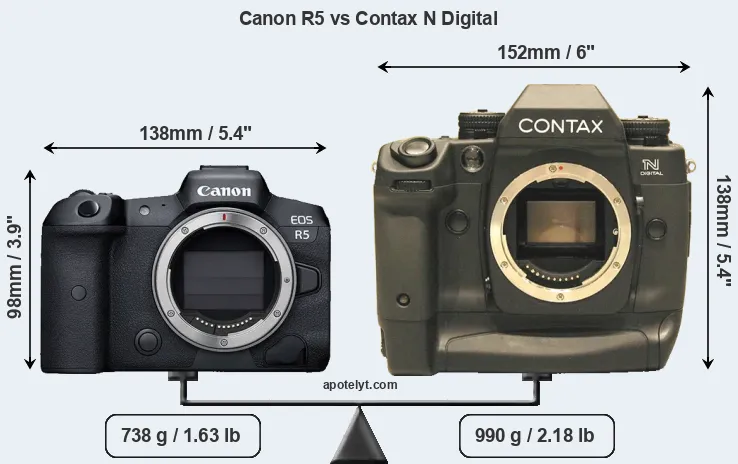 If the front view area (width x height) of the cameras is taken as an aggregate measure of their size, the Contax N Digital is considerably larger (55 percent) than the Canon R5. Moreover, the N Digital is markedly heavier (34 percent) than the R5. It is worth mentioning in this context that the R5 is splash and dust resistant, while the N Digital does not feature any corresponding weather-sealing.
