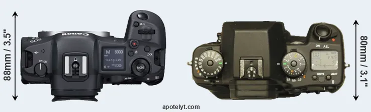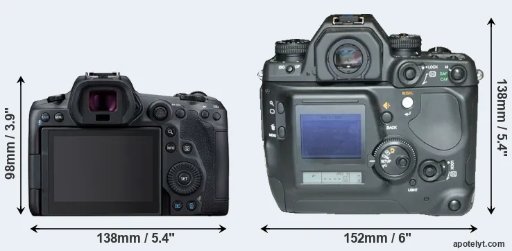 The physical size and weight of the Canon R5 and the Contax N Digital are illustrated in the side-by-side display below. The two cameras are presented according to their relative size. Three consecutive views from the front, the top, and the rear side are shown. All width, height and depth dimensions are rounded to the nearest millimeter.