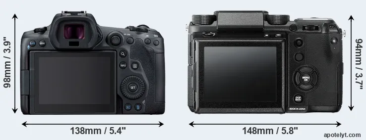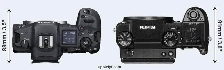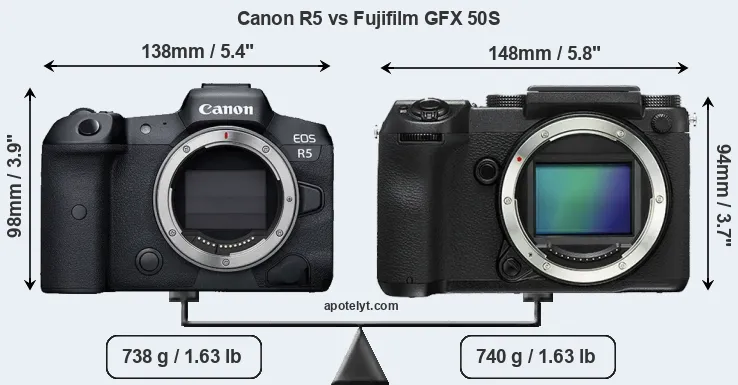An illustration of the physical size and weight of the Canon R5 and the Fujifilm GFX 50S is provided in the side-by-side display below. The two cameras are presented according to their relative size. Three consecutive views from the front, the top, and the rear side are shown. All width, height and depth dimensions are rounded to the nearest millimeter.