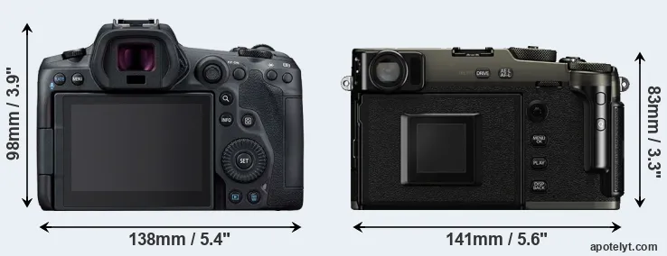An illustration of the physical size and weight of the Canon R5 and the Fujifilm X-Pro3 is provided in the side-by-side display below. The two cameras are presented according to their relative size. Three consecutive views from the front, the top, and the rear side are shown. All size dimensions are rounded to the nearest millimeter.