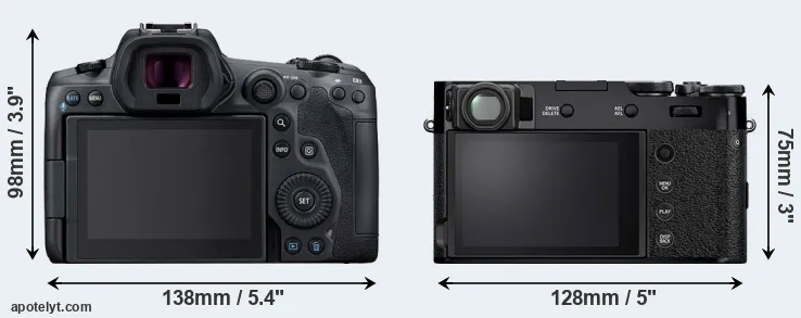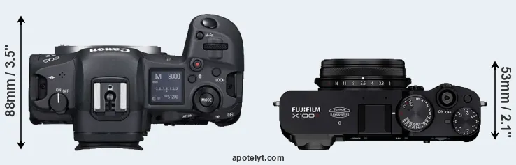 The physical size and weight of the Canon R5 and the Fujifilm X100V are illustrated in the side-by-side display below. The two cameras are presented according to their relative size. Three successive views from the front, the top, and the rear are shown. All width, height and depth dimensions are rounded to the nearest millimeter.