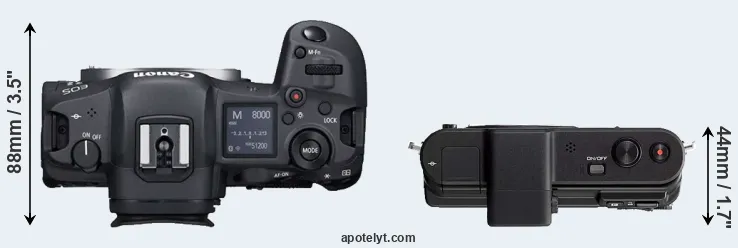 An illustration of the physical size and weight of the Canon R5 and the Nikon 1 V1 is provided in the side-by-side display below. The two cameras are presented according to their relative size. Three successive views from the front, the top, and the rear are shown. All width, height and depth dimensions are rounded to the nearest millimeter.