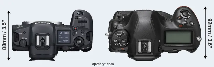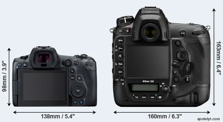 The side-by-side display below illustrates the physical size and weight of the Canon R5 and the Nikon D6. The two cameras are presented according to their relative size. Three consecutive views from the front, the top, and the rear side are shown. All width, height and depth dimensions are rounded to the nearest millimeter.